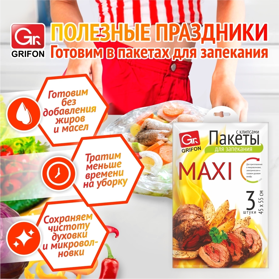 В коллекции товаров для приготовления есть пакеты GRIFON Maxi,в упаковке 3 пакета размером 45 на 55 сантиметров и удобные клипсы для закрывания. Пакеты удобны тем, что создают изолированную оболочку, внутри которой блюда готовятся в собственном соку. Курица, овощи, рыба и мясо готовятся намного быстрее, чем в открытом виде! При этом все блюда получаются очень нежными и вкусными. Овощи и мясо можно готовить не просто одновременно, а в одном и том же пакете.